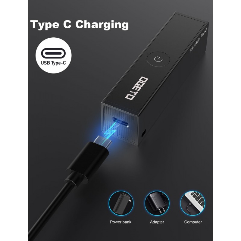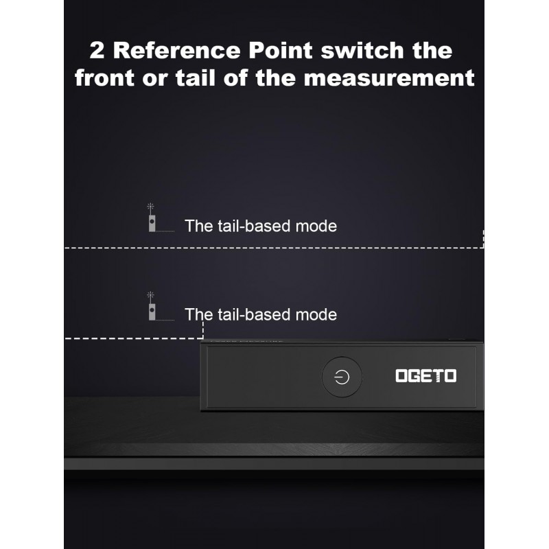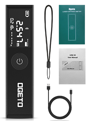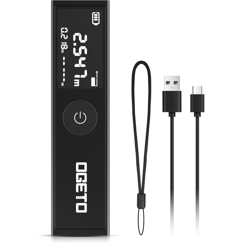 Medidor de distância a laser compacto e recarregável com alcance de 30 metros e alta precisão de ±2 mm. Possui ecrã LCD preto de alto contraste, medição contínua, cálculo de área e volume, além da função pitagórica. Inclui referência frontal e traseira ajustável e carregamento via USB-C para maior conveniência.