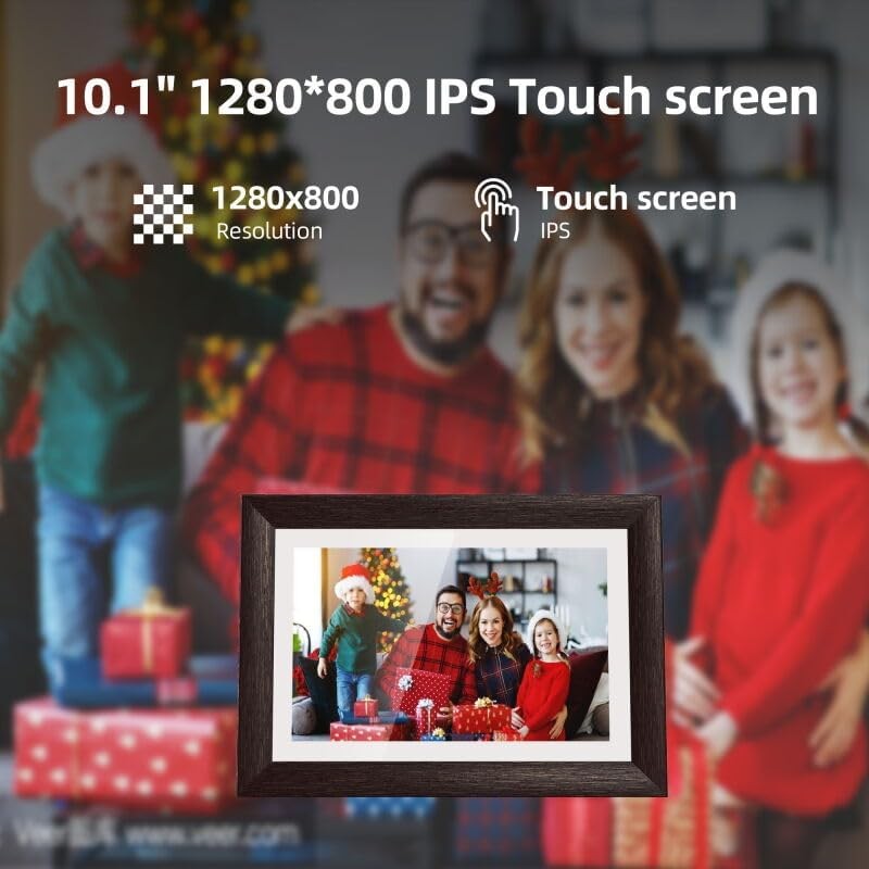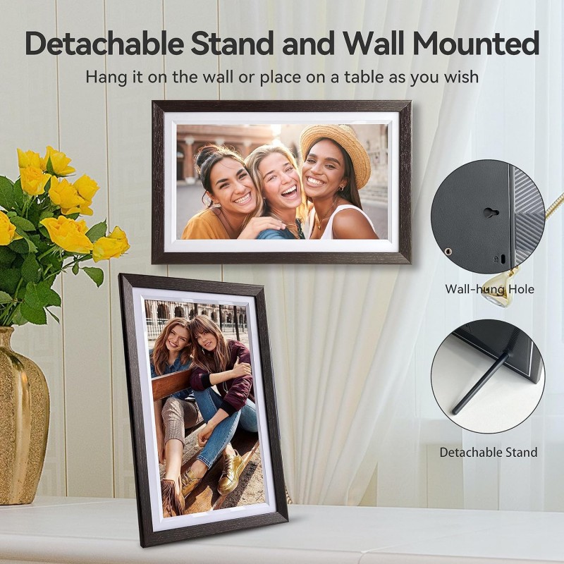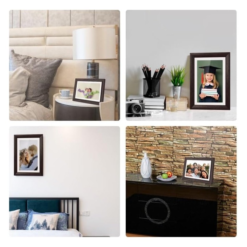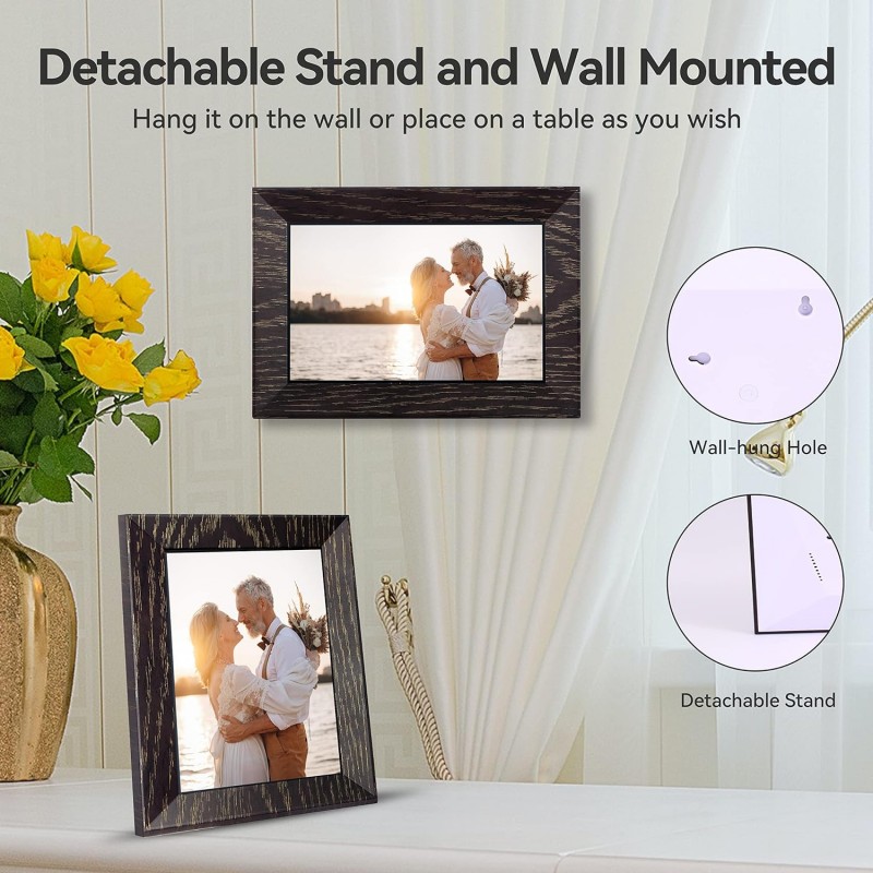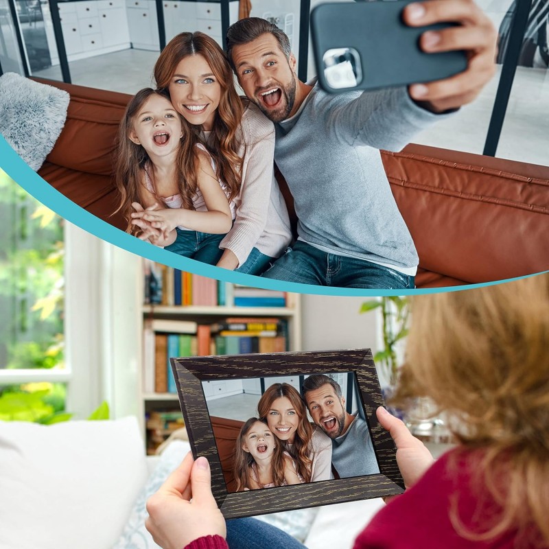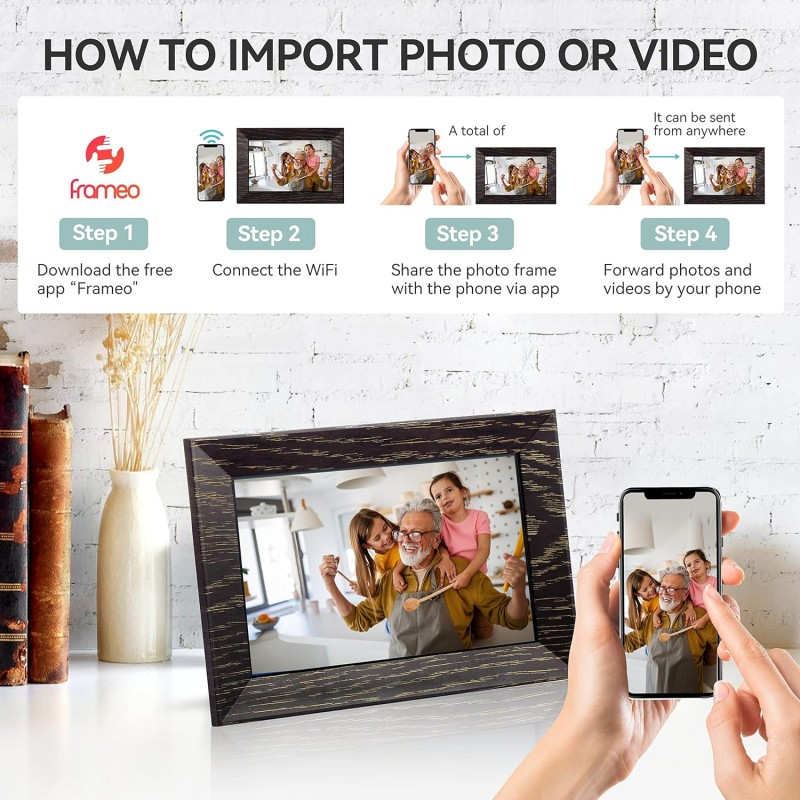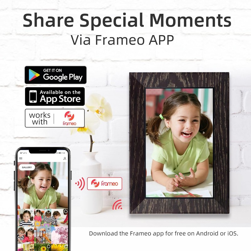 A Moldura Digital Wi-Fi de 7 polegadas oferece uma forma moderna e interativa de exibir suas fotos favoritas diretamente de seu smartphone. Com uma tela táctil IPS de 1024 x 600, proporciona imagens claras e nítidas em um design elegante de cor castanho nogueira. Este dispositivo não só exibe suas fotos como também permite compartilhá-las instantaneamente através da aplicação Frameo, tornando-a a escolha perfeita para manter conexões familiares e com amigos, seja qual for a ocasião.