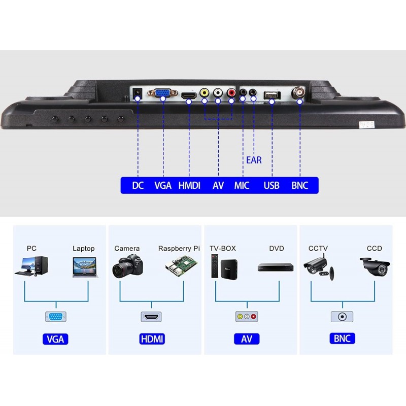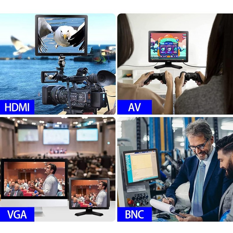 Interfaces Múltiplas: Inclui BNC, VGA, HDMI, USB, permitindo a conexão fácil com uma variedade de dispositivos, como PCs, consolas de jogos, câmaras DSLR, DVD, VCR, mini ecrãs de TV e mais.
