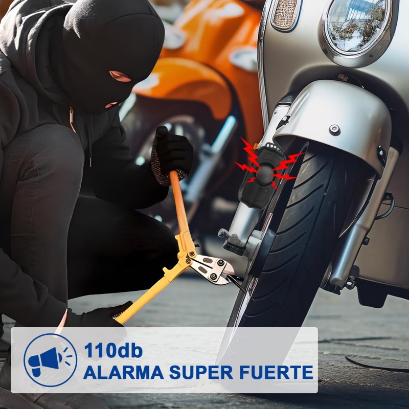 Alarme antirroubo de mota com volume de até 110 dB, pode assustar qualquer pessoa e atrair a atenção das pessoas. O anfitrião está equipado com uma bateria de polímero de lítio 500 mAh micro USB recarregável; o controlador utiliza pilhas de botão CR2016 3V.