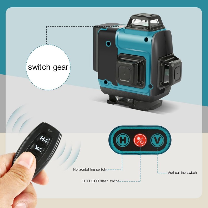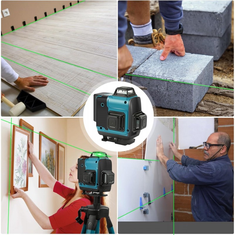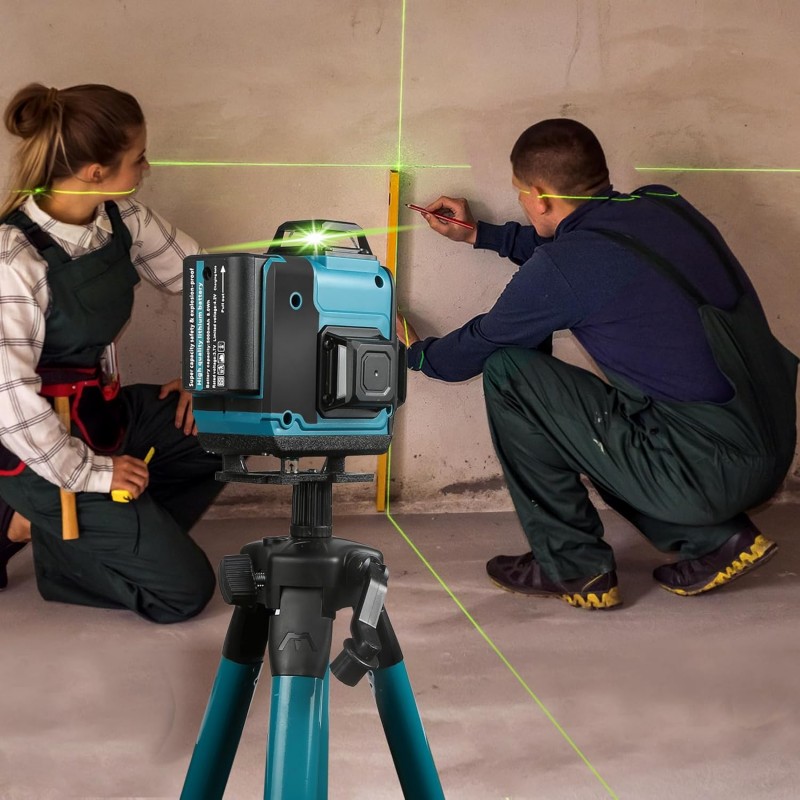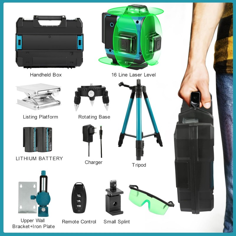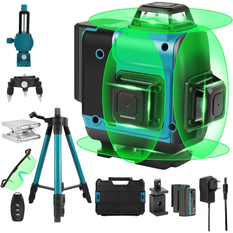 Nível laser autonivelante com feixe verde de alta precisão, proporcionando 16 linhas 4 x 360° para medições exatas em todas as direções. Inclui tripé, moldura de parede, comando remoto e acessórios para maior versatilidade. Ideal para construção e decoração.