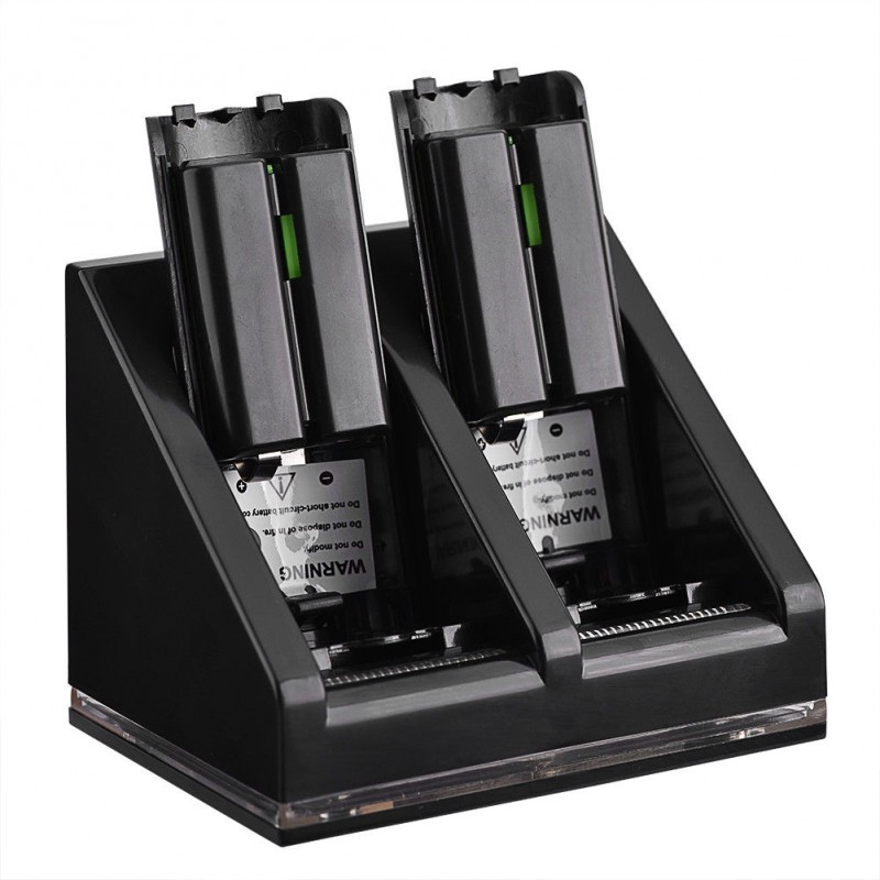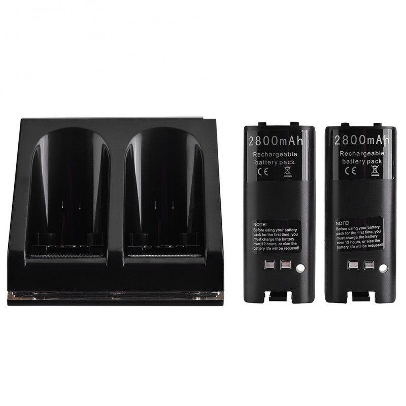 Carregador Novo c/ 2 Baterias para Comandos Wii 2 baterias de 2800 mAh incorporadas nas tampas para substituição da tampa do comando. Não precisa retirar baterias para carregar, é só pousar o comando no carregador.