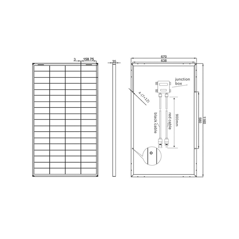 Painel solar monocristalino de 140W e 12V, com alta eficiência, vidro temperado resistente e estrutura em alumínio anodizado. Ideal para autocaravanas, casas de jardim, barcos e sistemas off-grid.