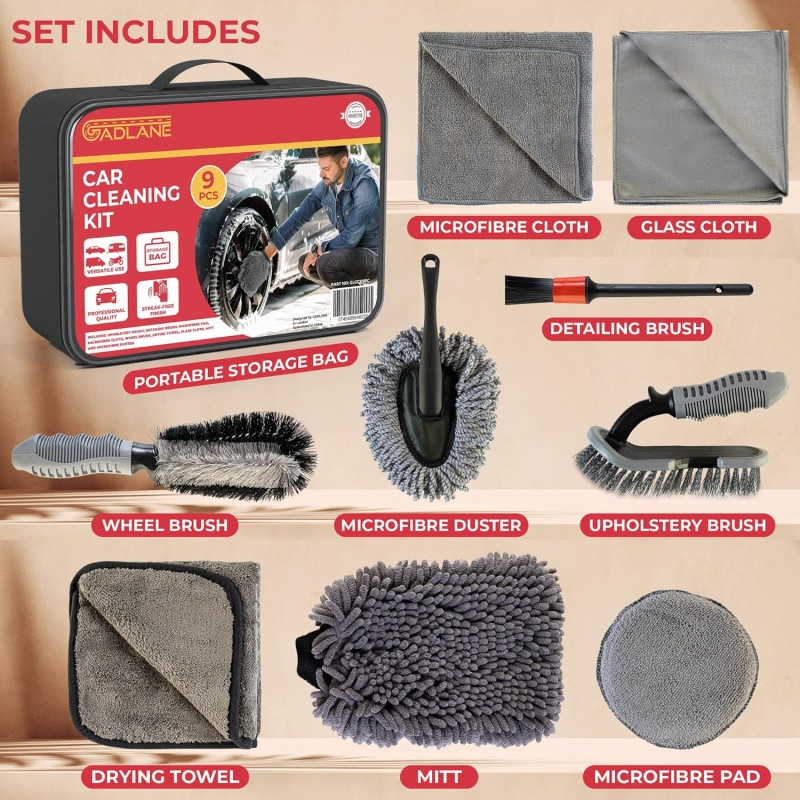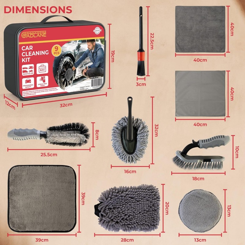 Descubra o nosso Kit de Limpeza de Carro de 9 Peças, incluindo tudo que precisa para manter seu carro limpo e brilhante, desde o interior até a carroceria.