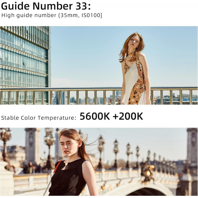 A temperatura de cor é de 5600K ± 200K, próxima à luz natural. Oferece três modos de disparo: Manual (M), S1 e S2. O modo S1 dispara em sincronização com o flash principal, enquanto o S2 sincroniza com o segundo disparo, ideal para setups de iluminação múltipla. Não suporta TTL nem configuração de menu da câmara.