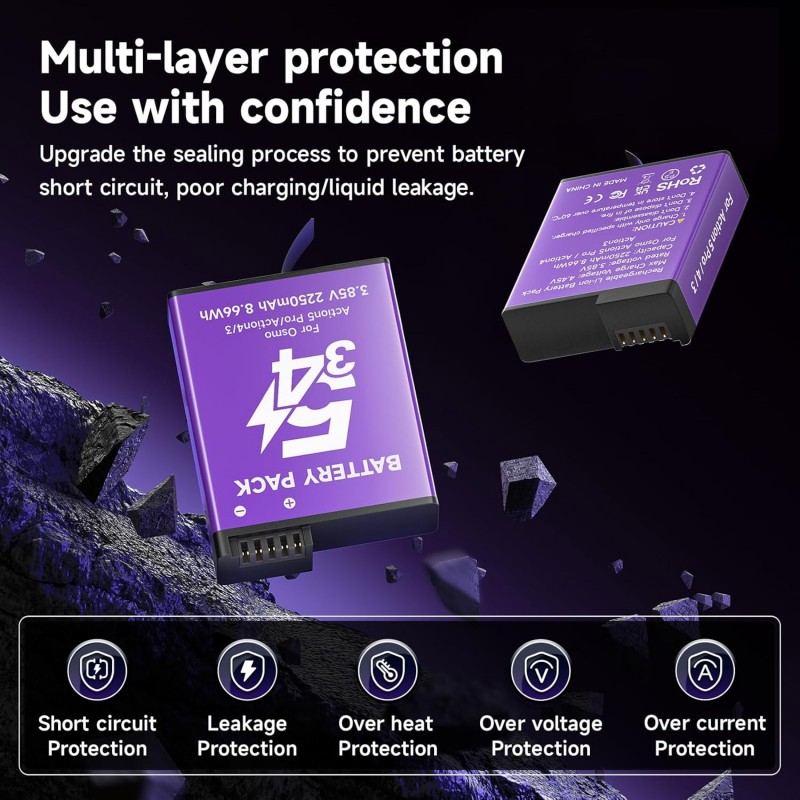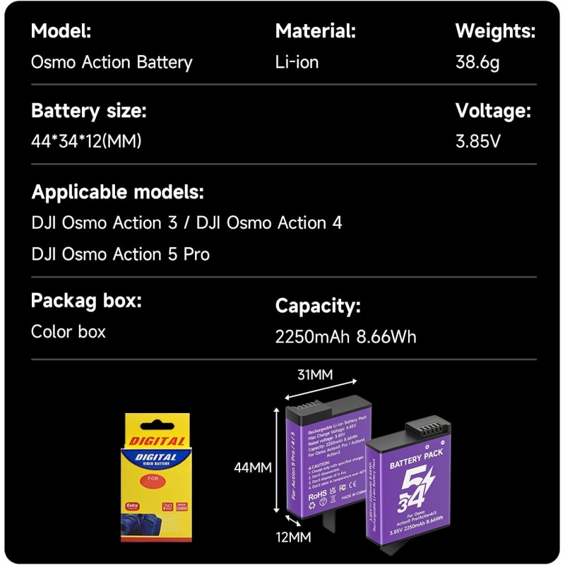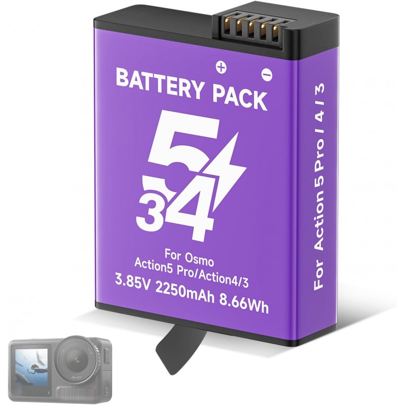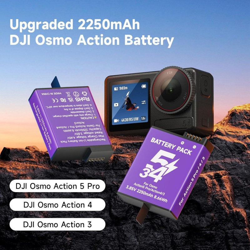 Bateria recarregável de iões de lítio de 2250 mAh compatível com câmaras desportivas DJI Osmo Action 5 Pro, Osmo Action 4 e Osmo Action 3. Proporciona maior autonomia, até 160 minutos de utilização, e inclui proteção contra sobrecarga, curto-circuito e sobreaquecimento.