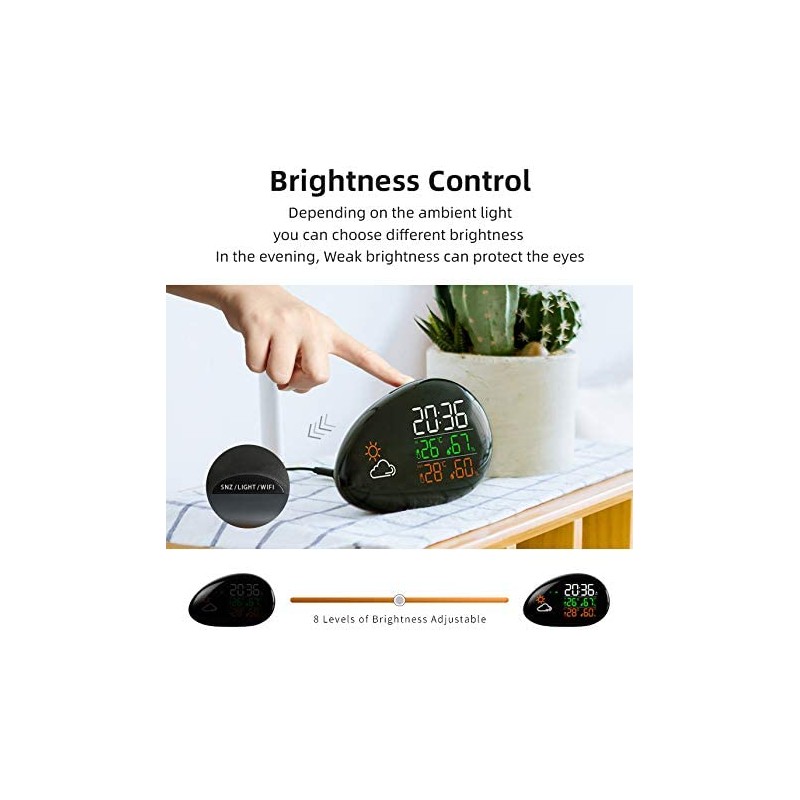 Ecrã LCD: Exibe claramente informações sobre o tempo, data, temperatura, humidade e previsões do tempo, com brilho ajustável em três níveis.