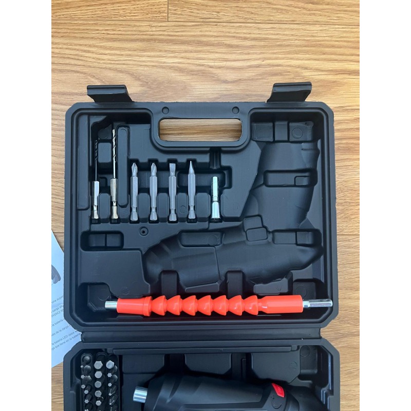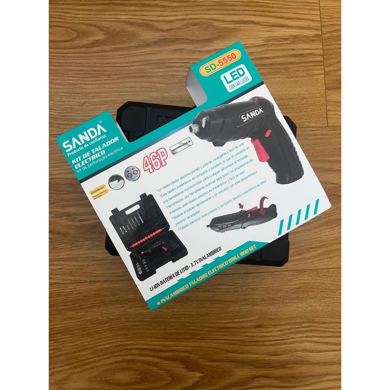 Berbequim/parafusador sem fios Sanda SD-5550 com luz LED, bateria de lítio recarregável de 3,7 volts, e 46 acessórios incluídos numa mala resistente. Ideal para tarefas domésticas e de bricolage.
