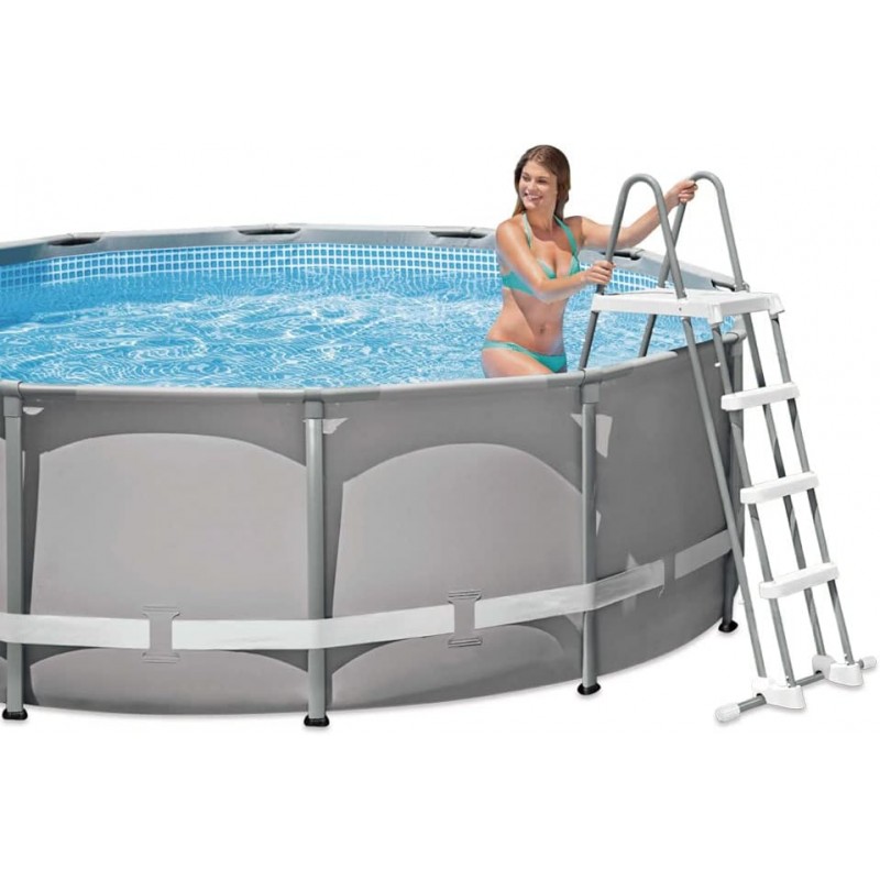 Escada de segurança Intex com 4 degraus de cada lado, estrutura em aço resistente à corrosão, degraus antiderrapantes removíveis e plataforma superior. Ideal para piscinas com altura entre 122 cm e 132 cm. Suporta até 136 kg.