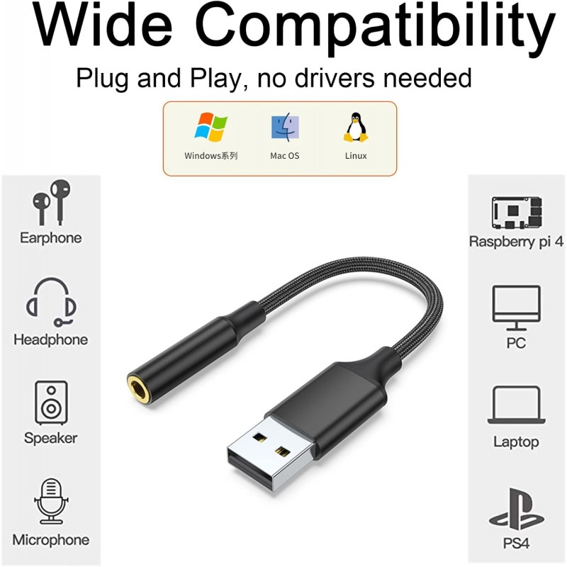 Adaptador de áudio USB para Jack 3,5mm TRRS com função dupla, leve e portátil. Compatível com Windows, Mac, Linux e PS4. Plug & Play, sem necessidade de drivers.
