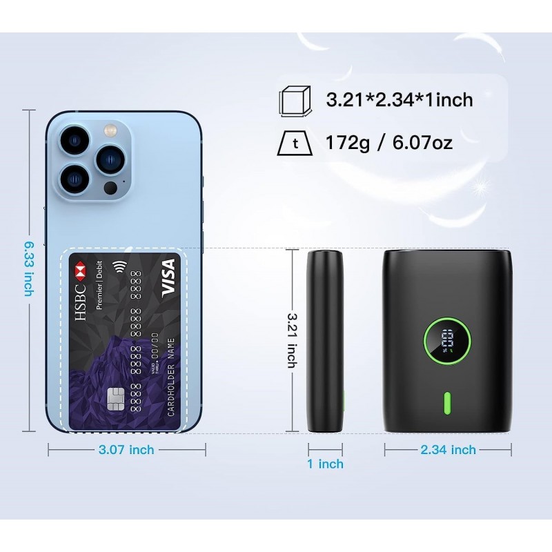 Design Leve e Compacto: Com dimensões de apenas 8,1 x 5,9 x 2,6 cm e um peso de 200 gramas, este mini power bank é extremamente portátil, cabendo facilmente na maioria dos bolsos ou malas.