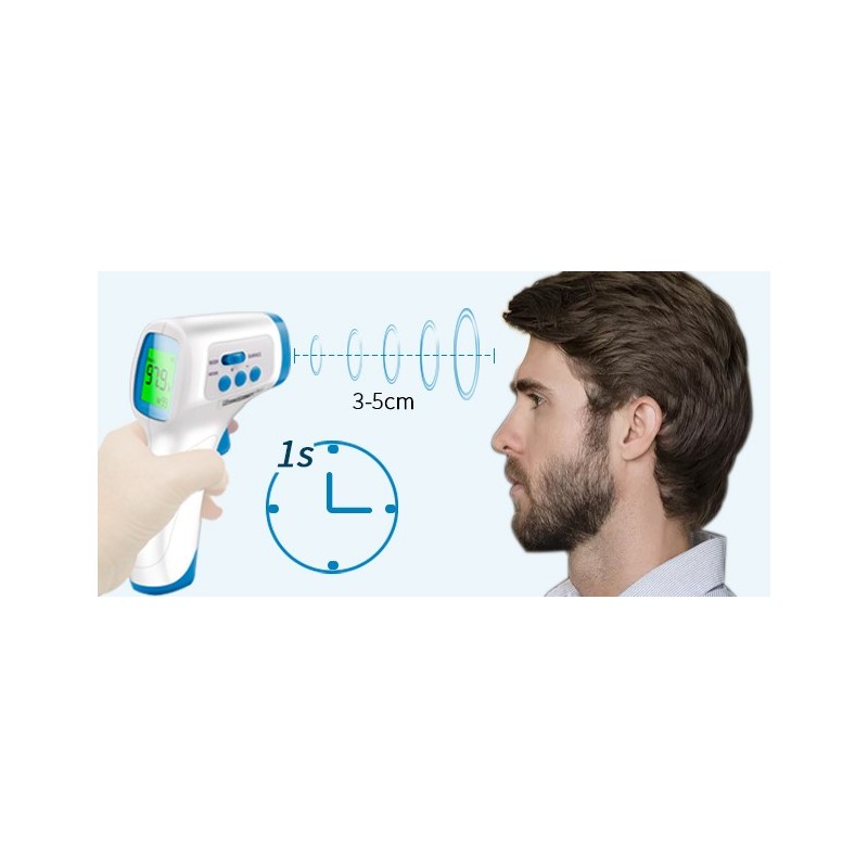 Medição sem contato: a tecnologia de infravermelho sem contato lê da testa (medição de temperatura/ estados de febre) sem contato físico, evita a infeção cruzada entre várias pessoas.