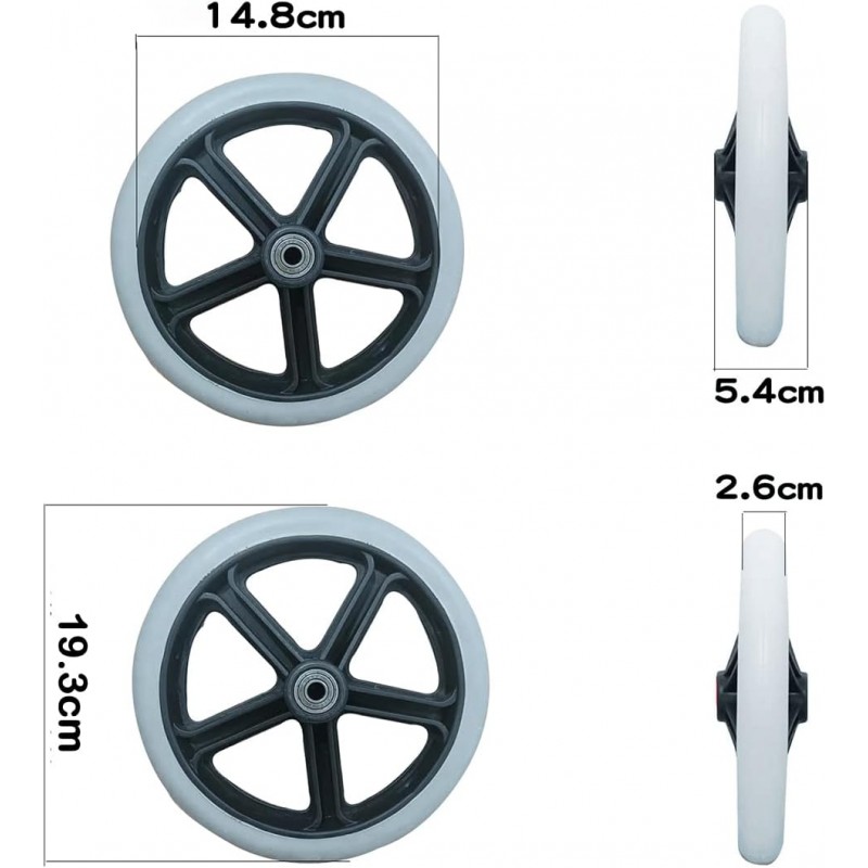 Facilidade de Instalação: Com um diâmetro de 20 cm e uma largura de 5 cm, estas rodas são facilmente instaláveis e compatíveis com a maioria das cadeiras de rodas pequenas, tornando a substituição rápida e descomplicada.