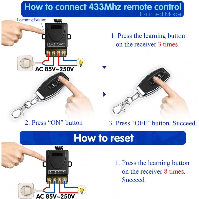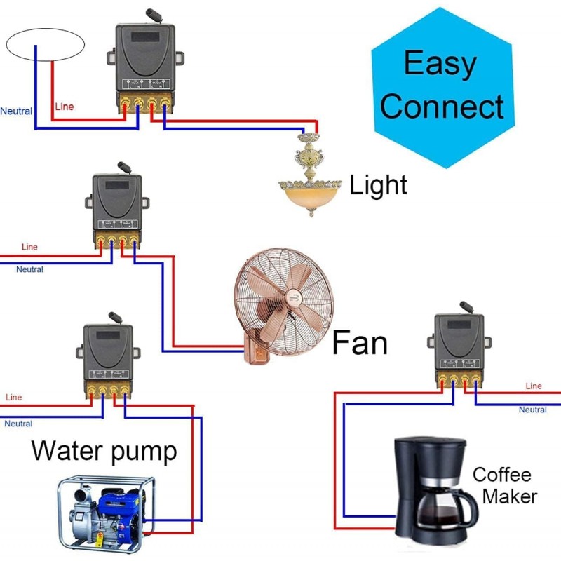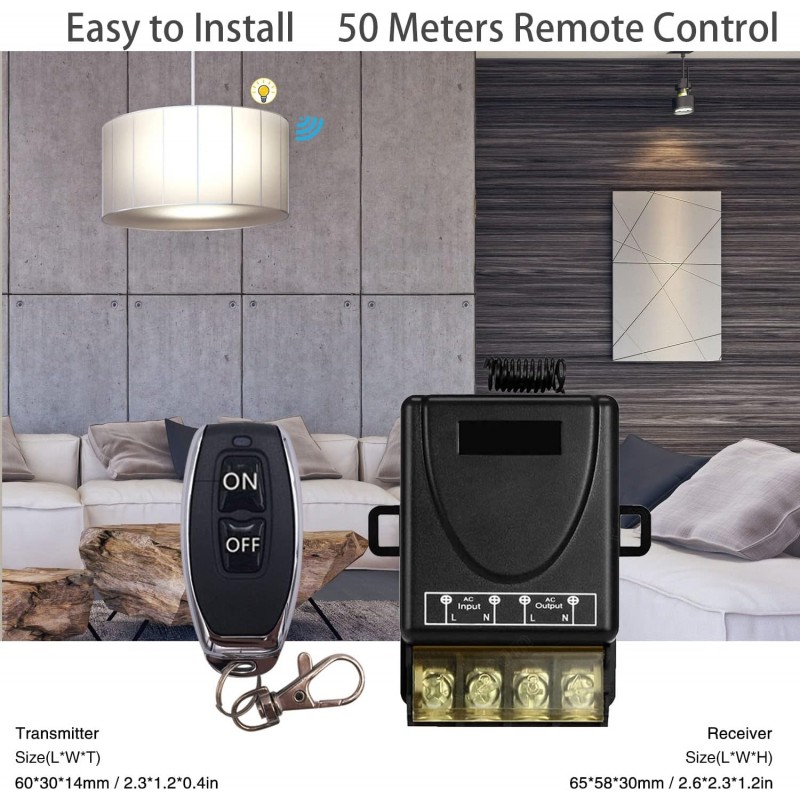 Este interruptor de controlo remoto sem fios de alta potência utiliza tecnologia de radiofrequência (RF) a 433 MHz e permite controlar remotamente diversos dispositivos elétricos como iluminação, bombas de água, ventoinhas, aquecedores, sistemas de alarme, entre outros.