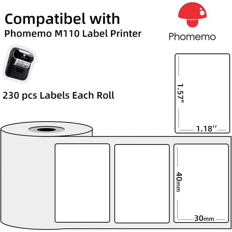 Com um tamanho prático de 40 x 30 mm e um total de 230 etiquetas por rolo, estas etiquetas térmicas diretas autocolantes são desenhadas para maximizar a eficiência da sua etiquetadora Bluetooth Phomemo M110/M120/M220/M221/M20.