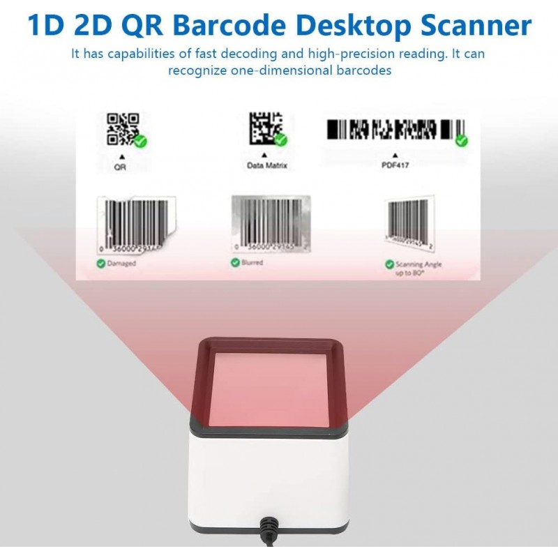 Este scanner de código de barras de mesa é uma solução eficaz para a digitalização rápida e precisa de códigos de barras 1D e 2D. Com tecnologia omnidirecional de 360°, pode capturar facilmente códigos de barras em vários tipos de superfícies, como etiquetas, cartões de plástico, papel, ecrãs de telemóvel ou de computador, sem necessidade de ajustar o ângulo de leitura.