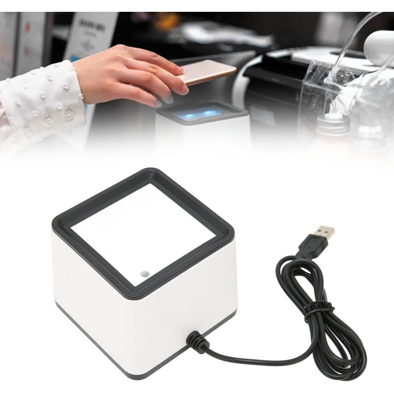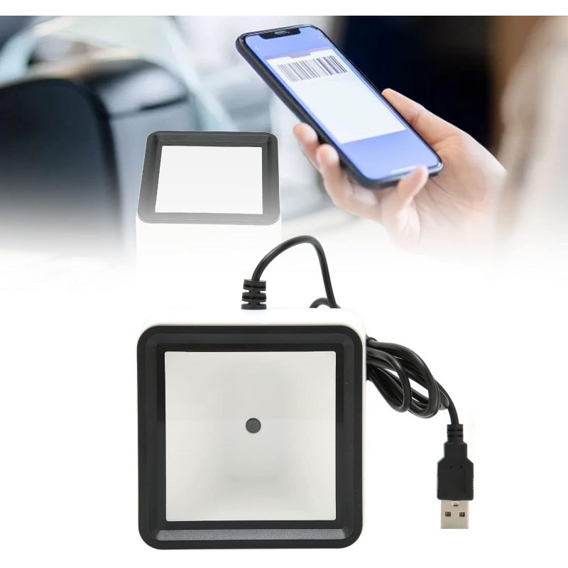 Scanner de código de barras 1D e 2D para mesa com digitalização omnidirecional de 360°. Ideal para leitura de códigos em etiquetas, ecrãs de telemóvel e papel, compatível com sistemas de pagamento móvel e conetividade via cabo USB.