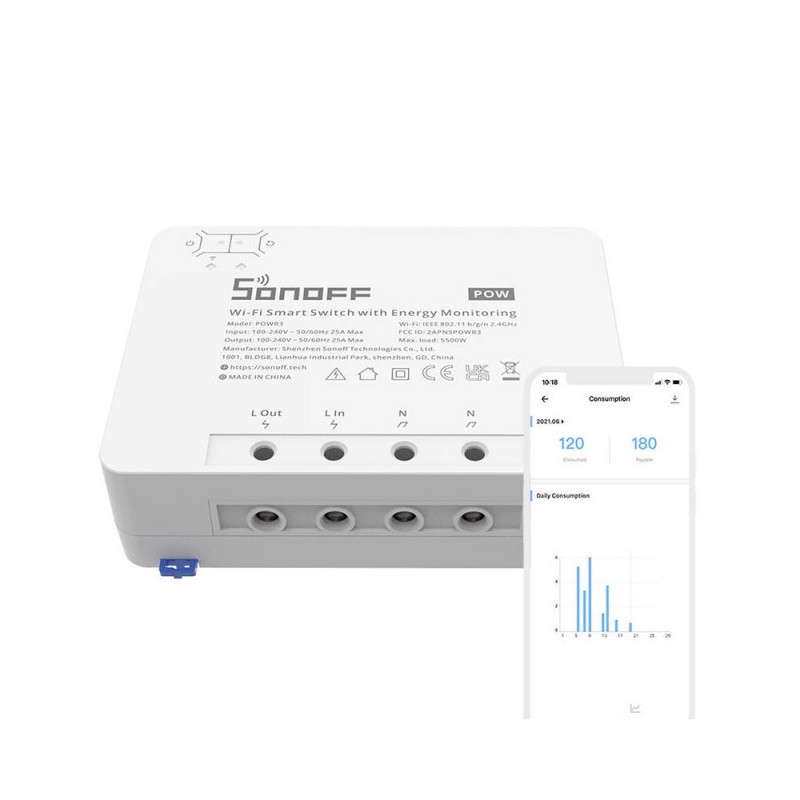 O switch Sonoff POWR3 aprimorado apresenta até 5500W de potência e suporta cargas de até 25A.