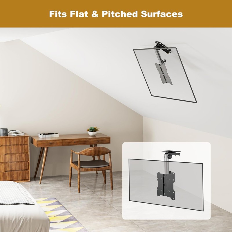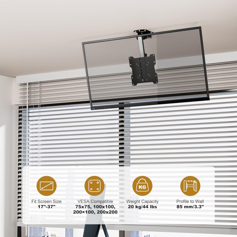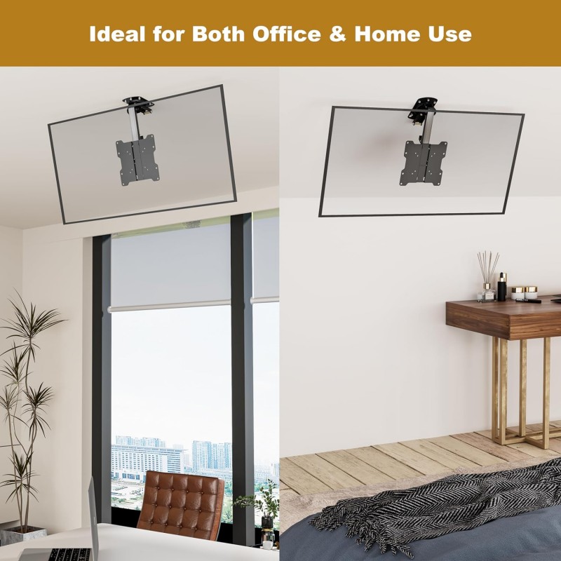 Este suporte de TV de teto giratório e dobrável é a solução ideal para economizar espaço e proporcionar a melhor experiência de visualização. Compatível com televisões de 13 a 33 polegadas, este suporte robusto e seguro é feito de metal de alta qualidade e permite uma inclinação de até 90 graus para baixo e rotação de 45 graus para a esquerda ou direita, garantindo que possa ajustar a TV para o ângulo perfeito.