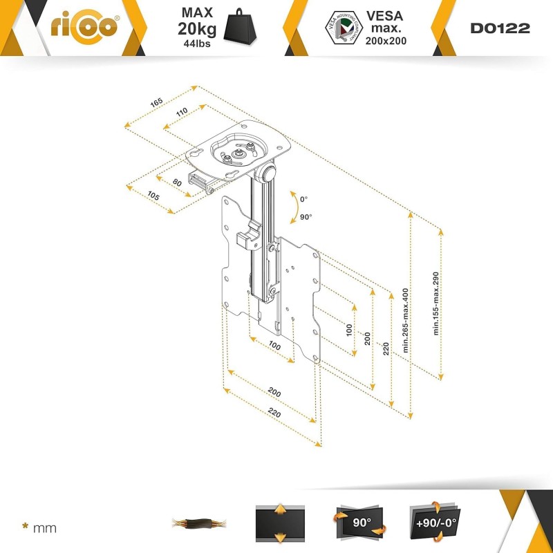 Elástico graças à distância do teto de 265 mm - 400 mm, o televisor ou o monitor podem ser alinhados no quarto ou perto do teto. A braçadeira pode ser aberta e fechada a qualquer momento com algumas etapas simples. * Foto de exemplo: O design pode variar.