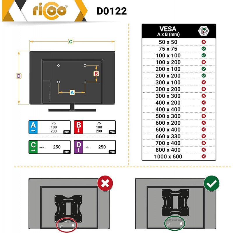 Meça os orifícios VESAMedição de distâncias entre orifícios / VESA A: máx. 200 mm B: máx. 200 mm Padrões VESA compatíveis (em mm): 75 x 75 | 100 x 100 | 200 x 100 | 200 x 200 Importante: Padrão VESA 100 x 200 não é compatível! |