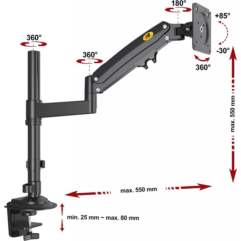 Este suporte oferece um braço com grande viagem, uma coluna robusta e ajustes suaves e precisos em vários eixos, proporcionando uma experiência de visualização personalizada e confortável.