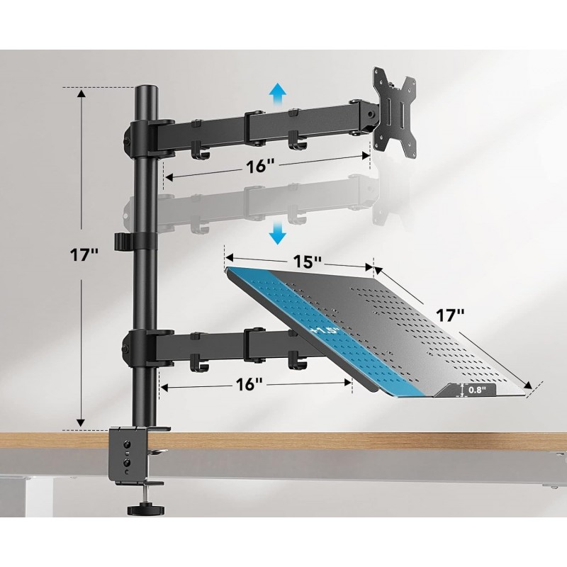 Acomoda um monitor de PC de até 27 polegadas e um portátil de até 15,6 polegadas simultaneamente.