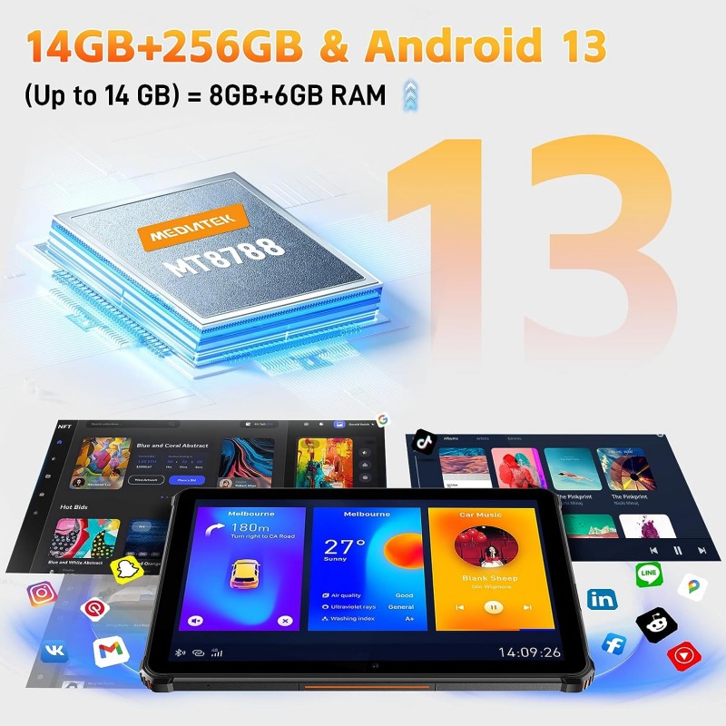 Equipado com 14GB de RAM e 256GB de ROM, expansível até 1TB através de cartão TF, o tablet funciona com um processador Octa-Core MT8788 para garantir uma experiência fluida e rápida.