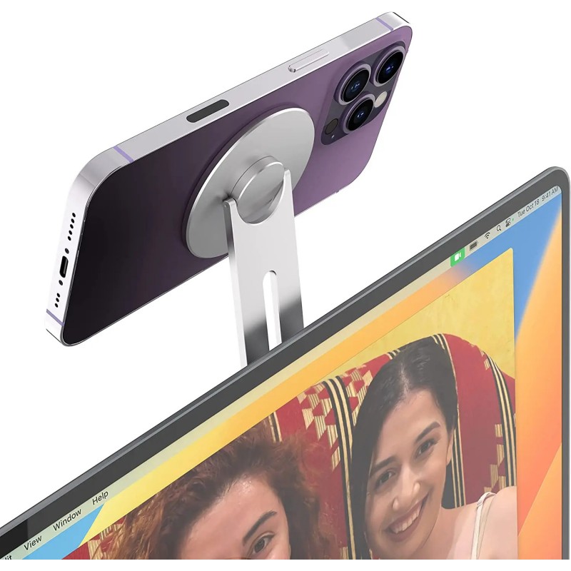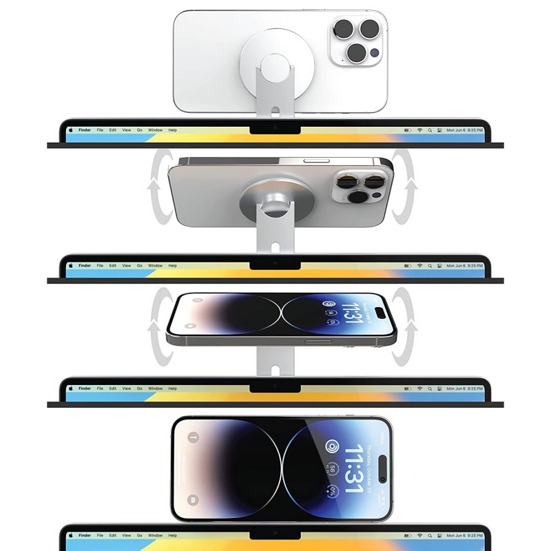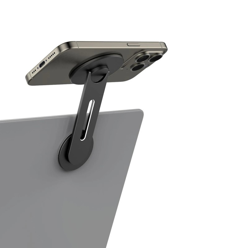 Suporte magnético ultrafino e dobrável para fixar o iPhone ao portátil ou monitor, ideal para usar como webcam com o modo Continuidade em Macs. Corpo em alumínio elegante e montagem fácil com braço giratório até 180°.