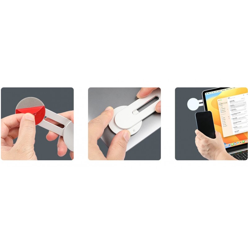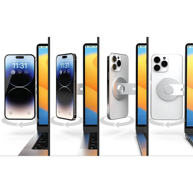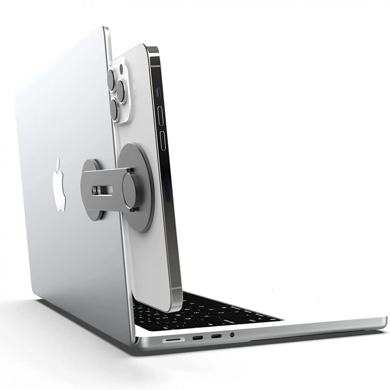 Basta aplicar o suporte no portátil com o adesivo incluído, girar o braço até à posição desejada e fixar o iPhone com o íman integrado.