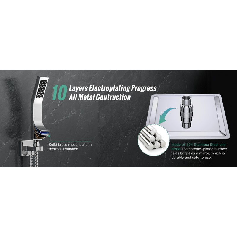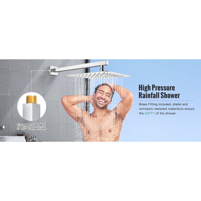 Chuveiro de Cabeça Quadrada de 10 polegadas: Fabricado em aço inoxidável 304, proporciona uma experiência de banho tipo chuva, ideal para descontrair no final de um dia intenso.