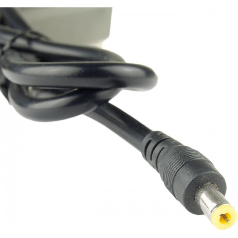 Conector Universal: A porta de saída de energia tem dimensões de 5,5 x 2,1 mm, sendo também compatível com plugues de 5,5 x 2,5 mm.