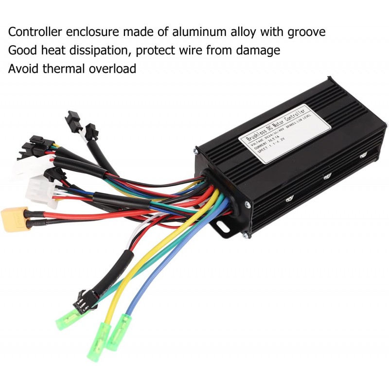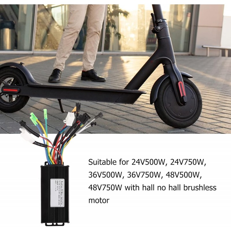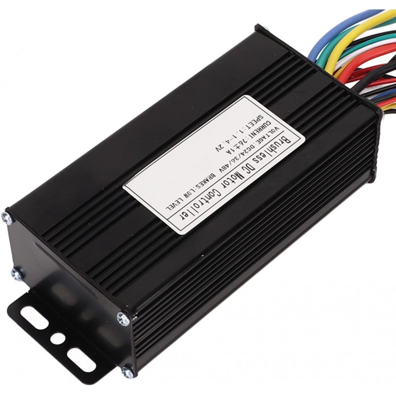 Controlador de motor sem escovas para bicicleta elétrica, compatível com tensões de 24V, 36V e 48V. Suporta motores de 500W e 750W. Feito em liga de alumínio para melhor dissipação de calor, garantindo durabilidade e estabilidade.