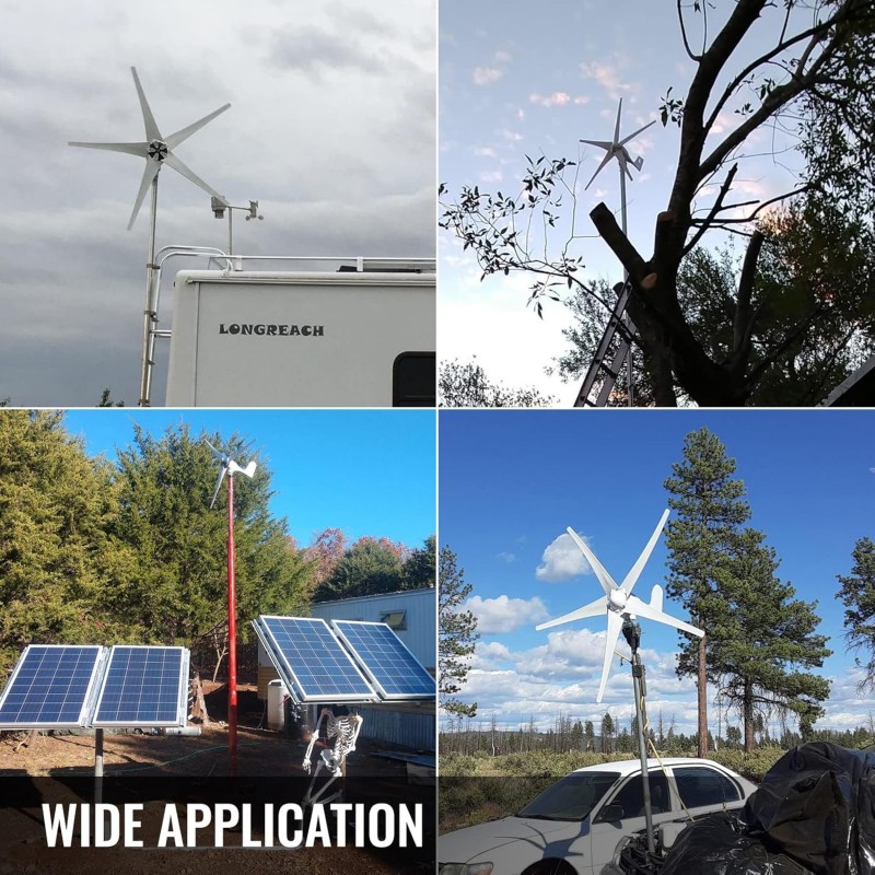 Gerador de turbina eólica de 500 W 12 V com 5 pás em fibra de nylon, controlador integrado e design compacto. Ideal para barcos, estradas, casas móveis e locais remotos. Instalação fácil e funcionamento silencioso.