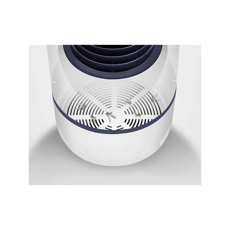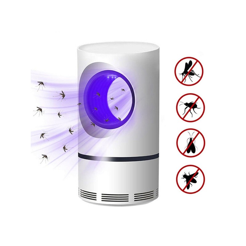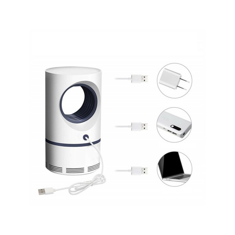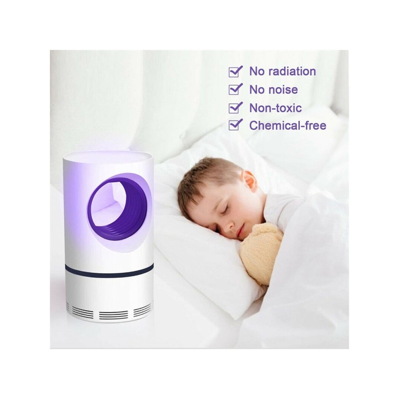 A luz roxa atrai-os e o ventilador suga-os para o compartimento inferior, onde ficam presos e morrem devido ao ar que circula no ventilador interno. Funciona através de ligação USB, pelo que o cabo USB (incluído) pode ser ligado a uma ficha (com adaptador USB, não incluído), a um computador portátil ou a um powerbank para utilização no exterior.