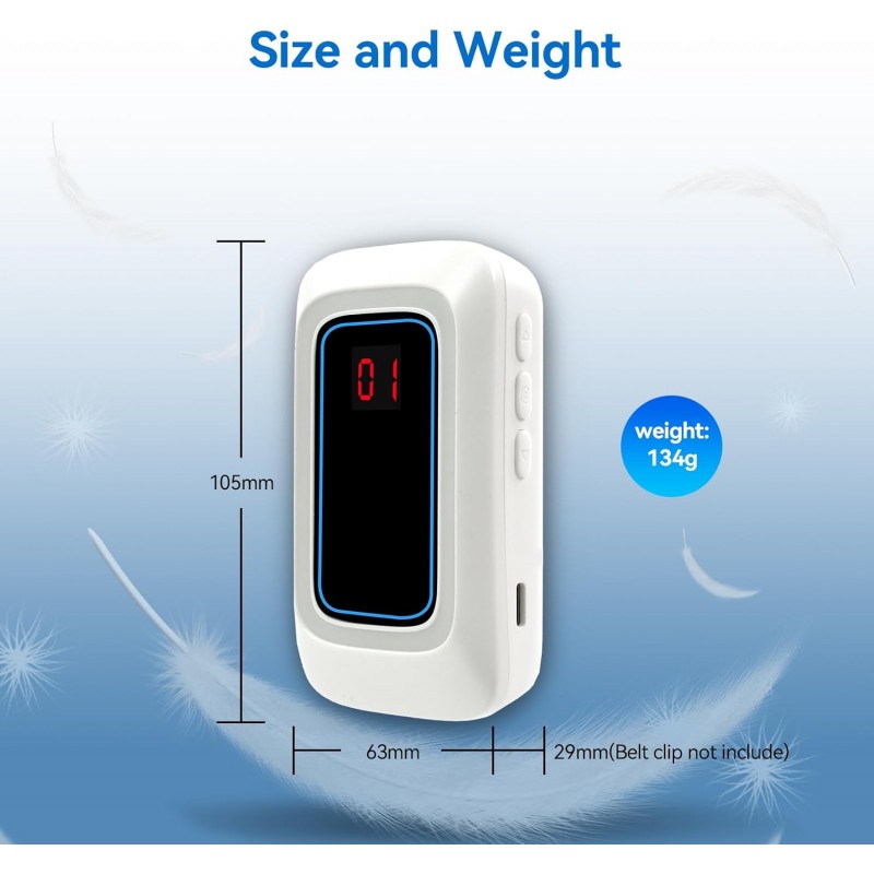 O recetor é leve, portátil e pode ser usado com clipe de cinto, cordão ou colocado na base de carregamento. A bateria de 1500 mAh oferece autonomia até 3 a 4 dias em standby e carrega totalmente em cerca de 7 horas.