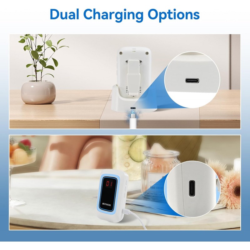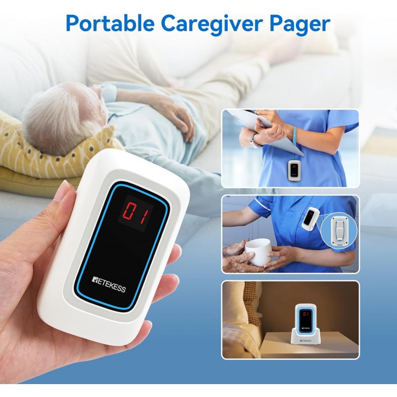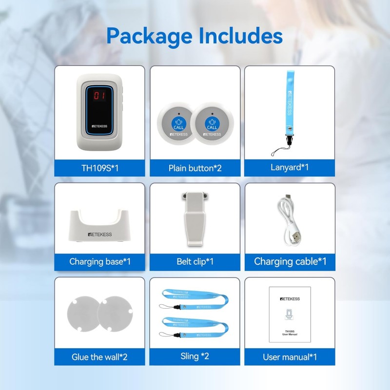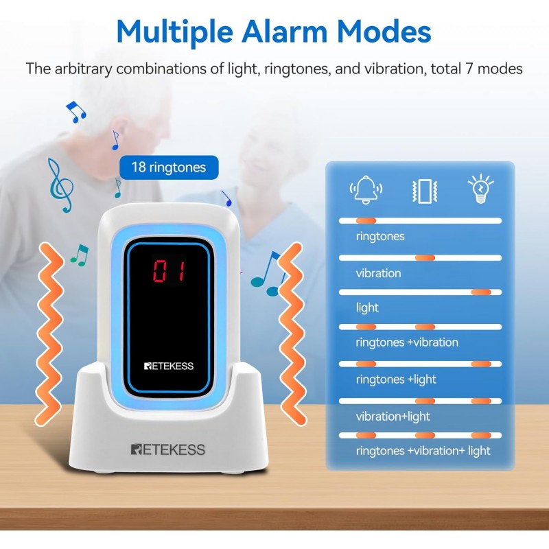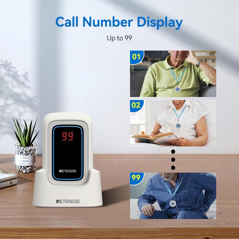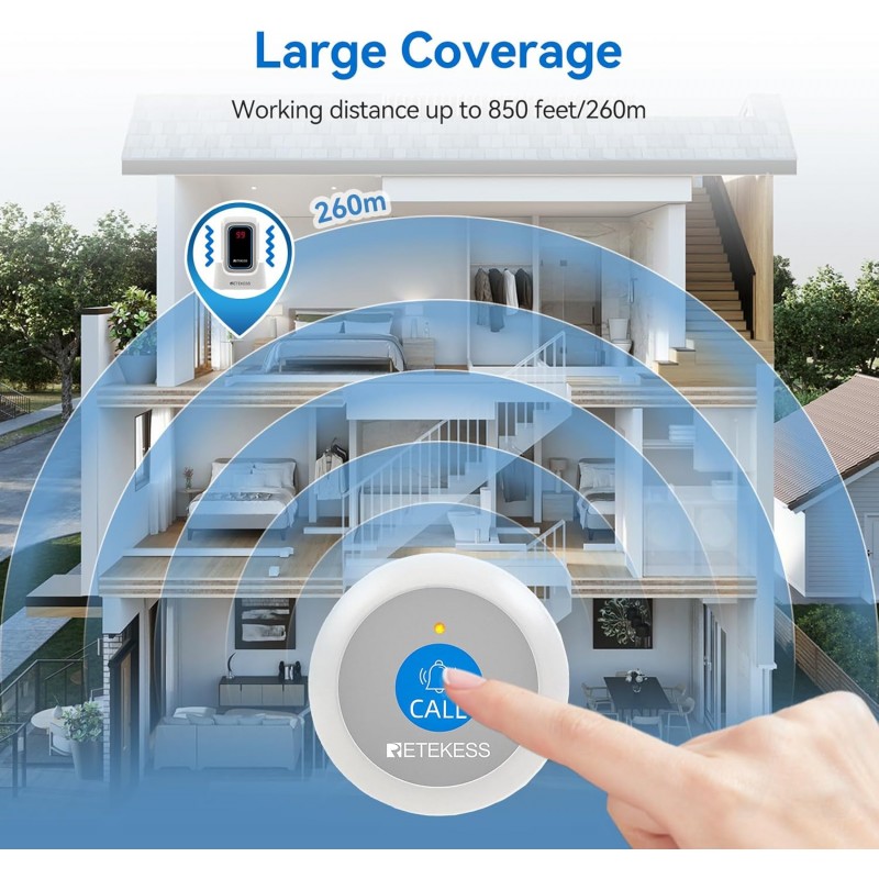 O Retekess TH109S é um sistema de chamada sem fios prático e fiável, ideal para idosos, cuidadores, pessoas com mobilidade reduzida ou uso em casa. Permite chamadas rápidas de emergência com um simples pressionar de botão, garantindo resposta imediata.