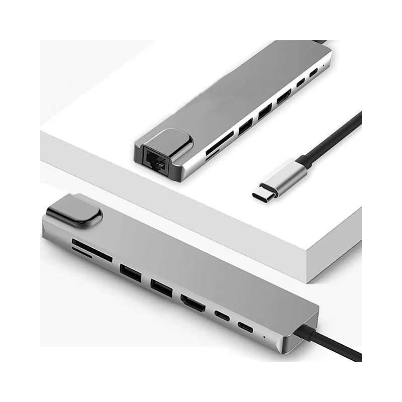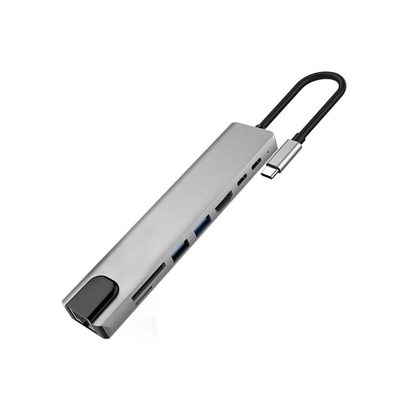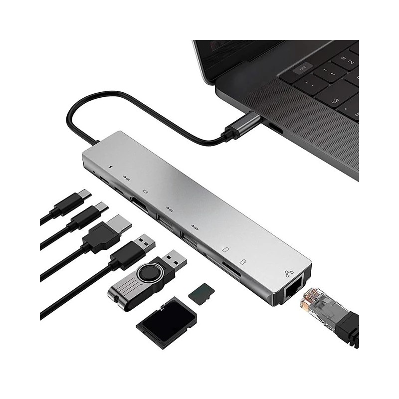 Hub 8 em 1 Tipo C para HDMI, USB 3.0, RJ45 10 / 100m lan, PD TF, Adaptador Conversor de Cartão de Memória