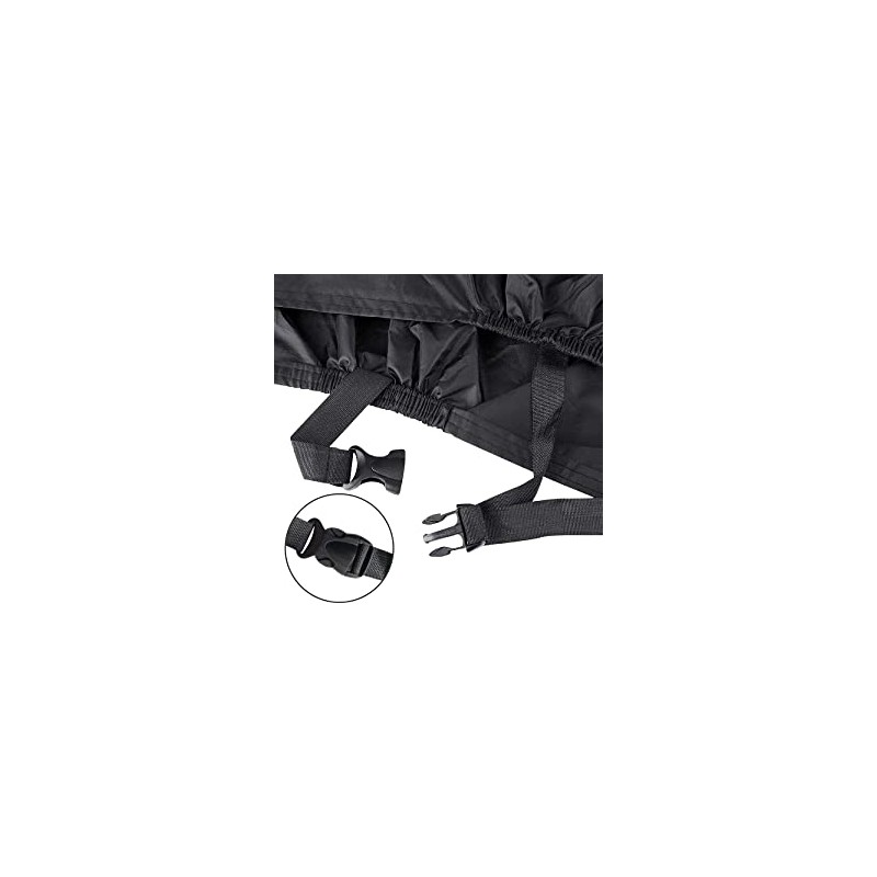 A capa é segura mesmo em ventos fortes graças às bainhas elásticas na frente, no centro e na traseira, e à fivela na parte traseira.