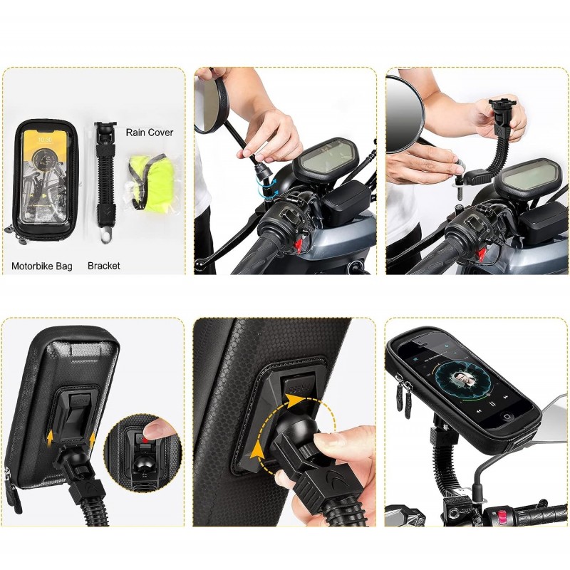 Facilidade de Instalação: Instale o suporte de forma simples e rápida, encaixando-o entre o espelho retrovisor e a mota, e apertando os parafusos. Adequado para todas as motocicletas, bicicletas elétricas e scooters com espelhos retrovisores.